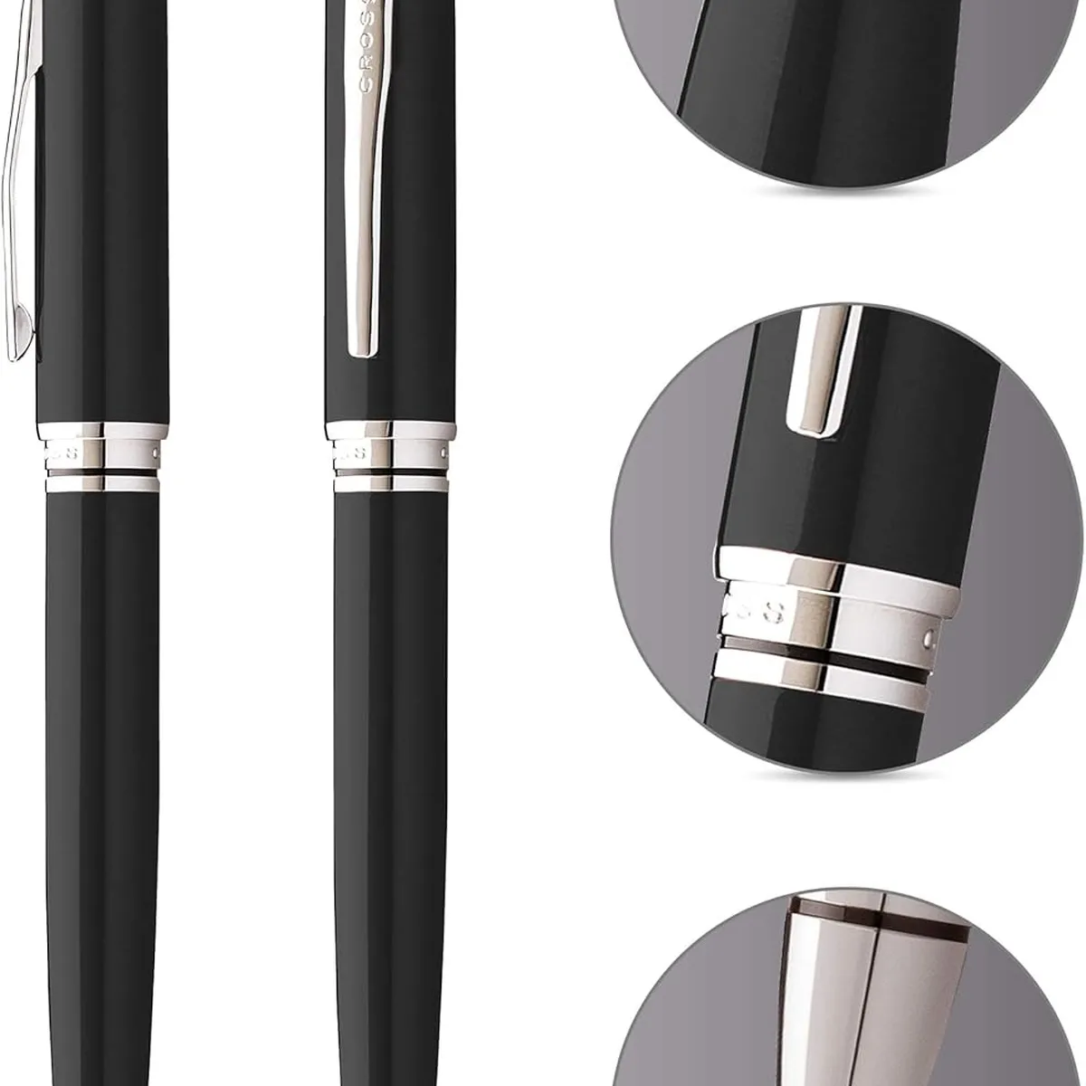 Na versão Esferográfica, a combinação entre o preto profundo e os detalhes cromados cria um visual sóbrio e versátil. O mecanismo de giro oferece praticidade imediata, enquanto o refil Cross 8513 (ponta média) garante escrita suave e constante, adequada para uso profissional e cotidiano. É uma escolha equilibrada, que une elegância discreta, funcionalidade e o prestígio da marca Cross.