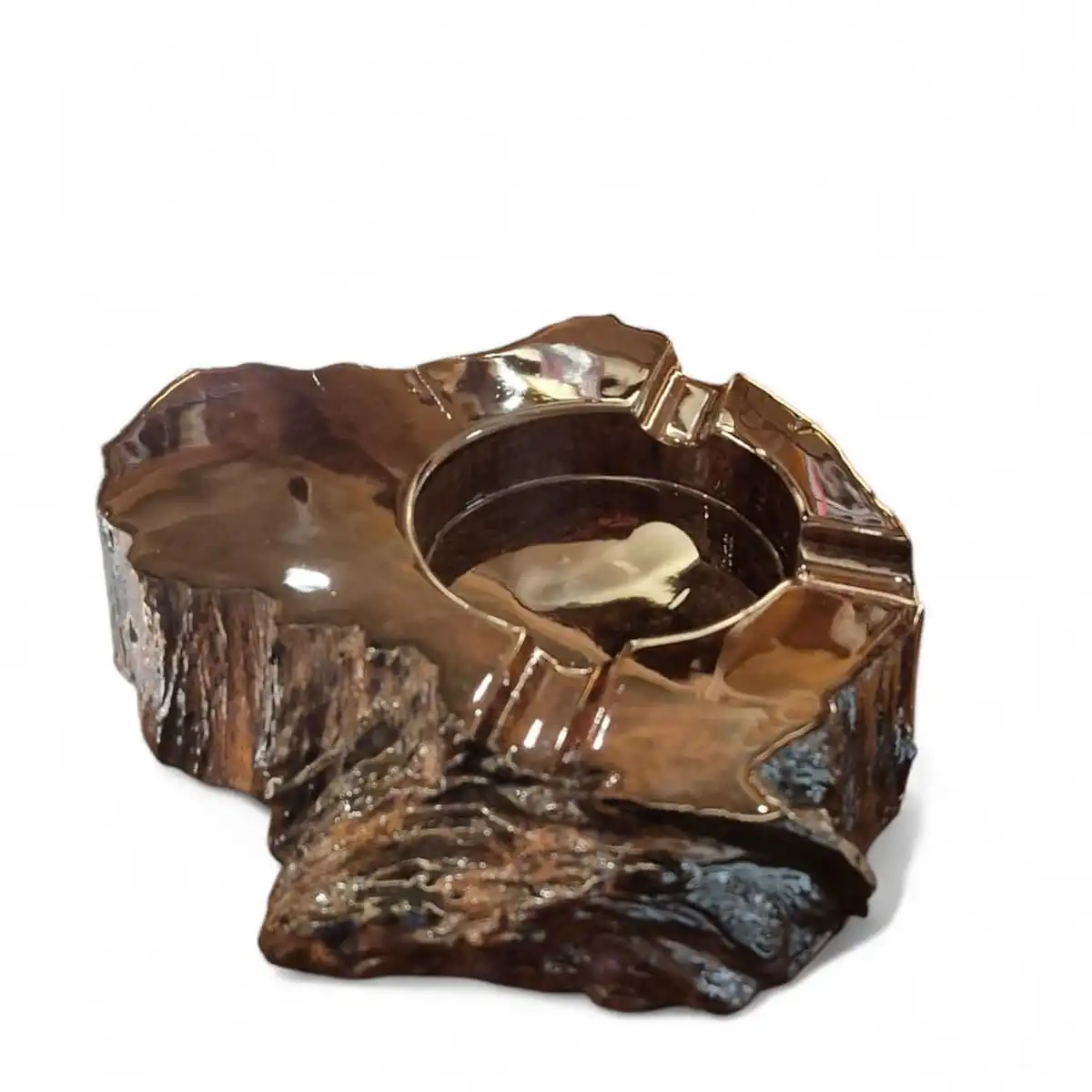 A peça preserva parte da forma natural do tronco, especialmente nas laterais e na base, criando um contraste orgânico com a parte superior usinada. O topo e as laterais receberam acabamento em resina, que sela a madeira, facilita a limpeza e evita que odores fiquem impregnados após o uso — um detalhe técnico essencial para um cinzeiro de uso frequente.
