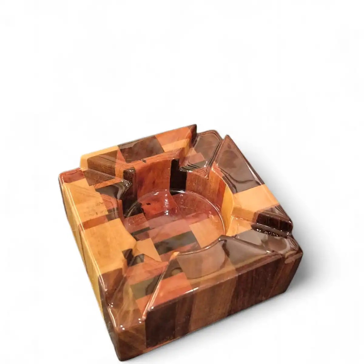 A parte superior recebe finalização em resina, aplicada de forma uniforme e transparente. Esse acabamento facilita a limpeza após o uso e evita que odores fiquem impregnados na madeira, tornando o cinzeiro especialmente adequado para charutos.