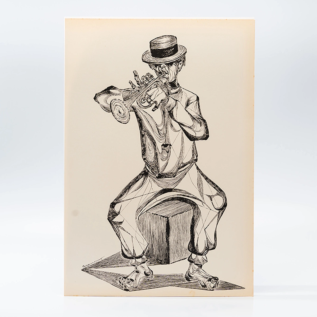 Nesta composição, um músico solitário é retratado sentado sobre um bloco geométrico, tocando um instrumento de sopro. O chapéu arredondado, a expressão concentrada e a postura curvada remetem à intensidade da execução, enquanto os pés descalços evocam simplicidade e proximidade popular. As linhas circulares que modelam o trompete e o sombreado denso nas roupas e no corpo criam um jogo rítmico entre textura e forma, sugerindo o fluxo sonoro que se projeta para além da cena. O contraste entre a precisão do rosto e o desenho anguloso das pernas reforça a expressividade característica de Graciano, em que o gesto musical é traduzido em dinamismo gráfico.