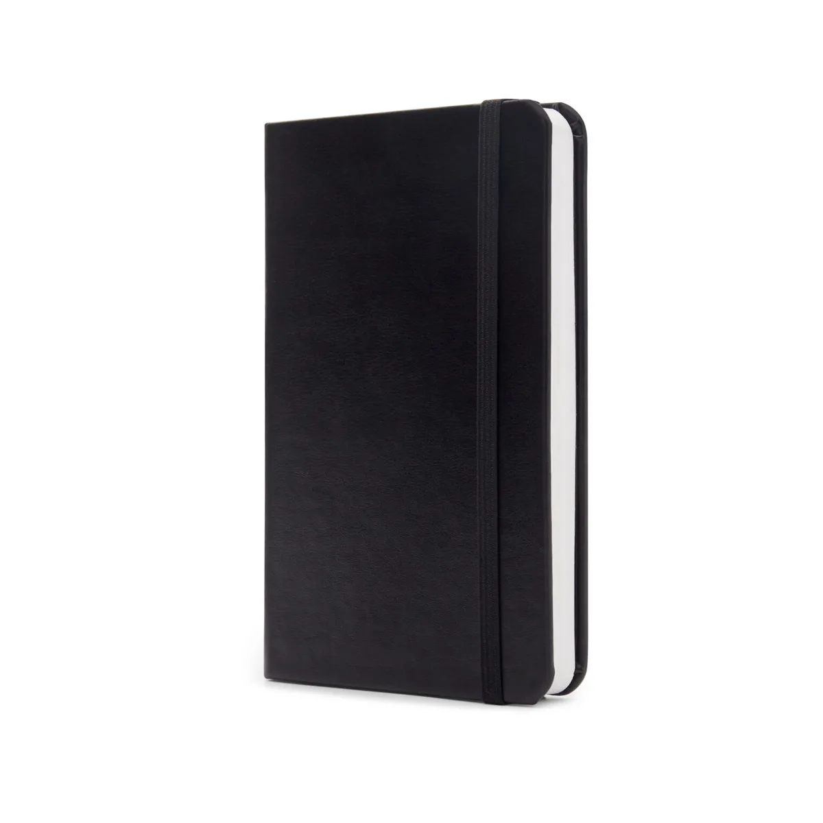 O caderno A6 de capa dura preta complementa o conjunto com elegância. Possui 144 páginas pautadas em papel de 90 g/m², resistentes ao uso de diversos tipos de caneta, inclusive tinteiros, sem que haja vazamento significativo. A capa rígida em couro sintético garante durabilidade e proteção, ideal para notas, listas ou registros do dia a dia.