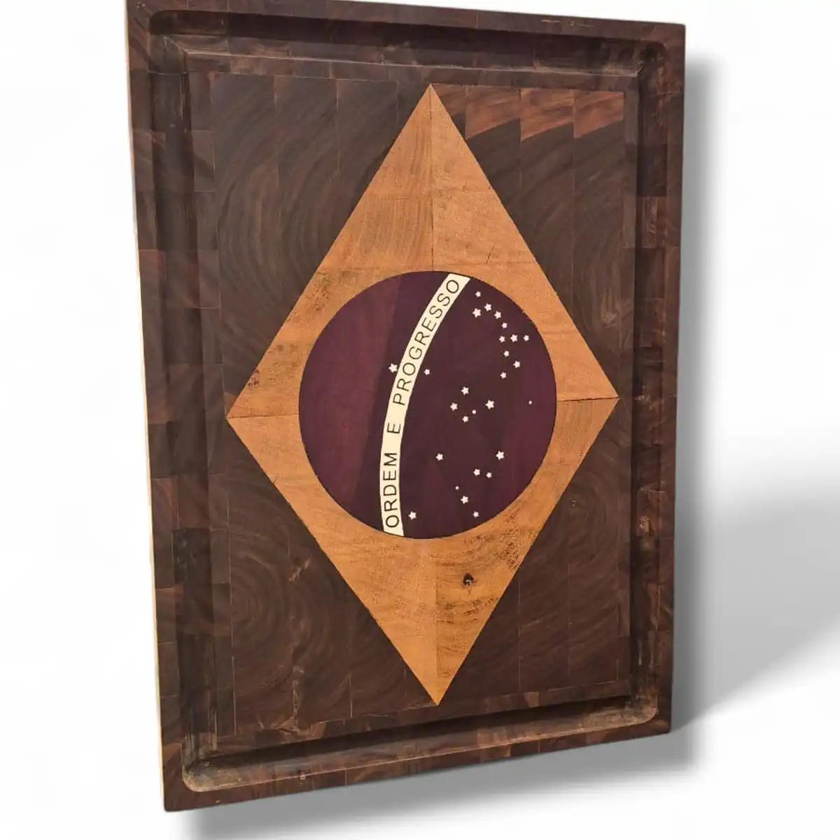 Essa tábua é uma peça de destaque: a Bandeira do Brasil aparece em marchetaria (mosaico de madeira com encaixes precisos), com contraste forte entre tons claros e escuros e um visual que chama atenção na cozinha ou na mesa posta.